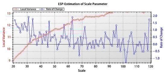 Based on the acquired shape and compactness parameter, estimation of the scale parameter is provided to help determine the most proper scale (Figure 7). Because over-segmentation produces fewer threats to classification accuracy than under-segmentation [62], and based on an exploration of the scale parameters in alternating regions, 34 was chosen as the value of the scale parameter.