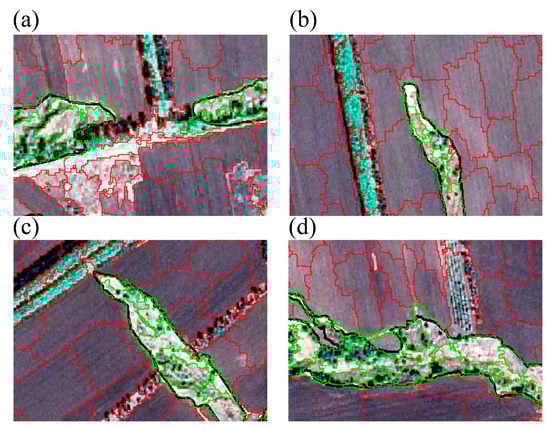 Segmentation results including objects of gully in green and objects of non-gully in red, with manually polygonized reference data of gully. As four examples, (a–d) show the segmentation results of different regions.