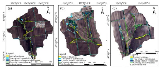 Validation of the extraction is essential for judging the fitness of the model presented in this study for gully extraction. Validation was implemented by an overlay analysis between the gully map obtained from the model and the inventory map of gully erosion provided by field surveys and expert knowledge. Adopting different approaches to assess the extraction results highlighted the added value [60]. In this study, we used two strategies to estimate the accuracy of the extraction: (1) The conventional method, whereby the classification results were divided into two types—correct or wrong compared to the reference data. (2) Inspired by similar studies [19,61], there were two kinds of errors of commission. One was a limited error of commission, which bordered on the correctly extracted areas and displayed similar spectral, textural, and geometric properties. The remaining error of commission was regarded as a true error of commission, which was entirely falsely extracted.