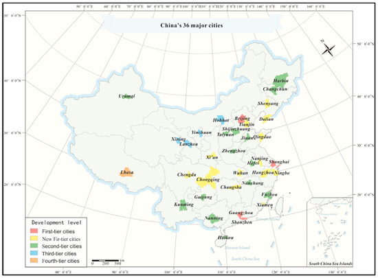 The study region involved 36 major cities in mainland China (Figure 1). Given that China’s cities are administrative entities and officially designated according to political status, economic development level, and total population [60], these cities are capitals for 23 provinces, capitals for 5 autonomous regions, 4 municipalities, and 4 other sub-provincial cities. The study period was from 1986 to 2015, with a total length of 30 years.