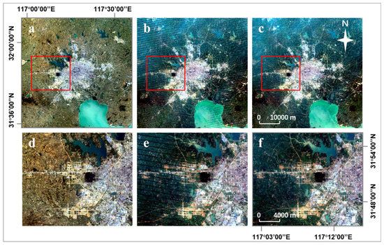 An example of missing pixel recovery. (a) The reference image for Hefei on 16 May 2008. (b) The target image for Hefei on 27 July 2008. (c) The recovery result. (d) Magnified area for the red rectangle in (a). (e) Magnified area for the red rectangle in (b). (f) Magnified area for the red rectangle in (c).