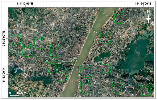 The 13 verification areas used for the accuracy assessment within the old city zone of Wuhan, China. The green rectangles indicate the target verification areas.