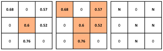 An example of impervious surface aggregation. The target pixel is highlighted in orange. When a target pixel is selected (the left image), a search is carried out within its eight-neighborhood until all the pixels greater than 0.5 are found (the middle image). Next, these pixels are assigned as the same number N. If this is the first search, then N would be 1; for the second search, N would be 2; and so forth.