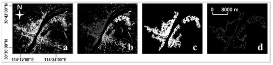 Corresponding to the definition of urban area in this paper, the urban area could be generated based on the high-density ISA images. Referring to previous research [71,74], the ISA fractions greater than 0.5 would be assigned as high-density ISA. Firstly, aggregation was applied on the ISA image. For each target pixel, searching in its eight-neighborhood, the target pixel and its neighborhood pixels whose ISA fraction was greater than 0.5 (i.e., high-density) were assigned as the same value (Figure 4), which was a similar approach to the City Clustering Algorithm (CCA) [74,75,76]. The search was undertaken until all the pixels were tested, after which an indexed map could be generated with a unique index for each aggregated area (Figure 5b). Secondly, with the help of the high-resolution images, the aggregated areas corresponding to the urban core, built-up clusters in suburb and the new districts set up by the government (e.g., Tianjin Binhai New District) were extracted. For example, from satellite images, we were able to find that the urban core for Wuhan city was located alongside the Yangtze River. Thus, the indexes for aggregated areas corresponding to the urban core could easily be found by visual interpretation. With those indexes extracted, the urban area could be picked up from Figure 3b,c by attribute extraction. Finally, the boundary of the aggregated built-up area was generated (Figure 5d). The areas within the boundary were assigned as the urban area, including all the impervious and pervious surfaces except water bodies.
