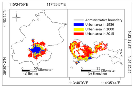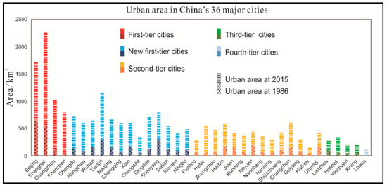 To qualify the urban expansion area and rates, by analyzing the three decades of satellite images, our results showed that almost all the cities experienced a dramatic expansion in this period. The urban area ratio (UAR) was calculated as the urban area in 2015 divided by the urban area in 1986. For those cities without clear images in 1986 or 2015, extrapolation or interpolation (for those cities with clear images before 1986 or after 2015) was used to obtain the urban area in 1986 or 2015. The UAR for all 36 cities was 5.85, and the expansion area was 15.51 km2 per city per year. In addition, many of the cities showed an average growth rate (AGR, Table 1) [36,41] of around 4–7%.