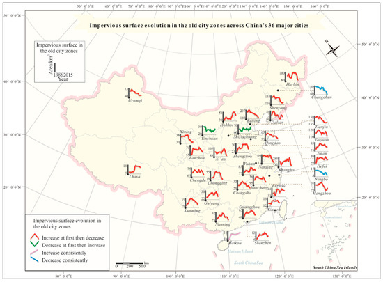 Impervious surface evolution in the old city zones across China’s 36 major cities.