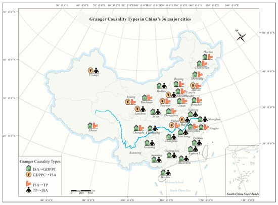 From the GCT in the 35 cities (Table S3; Figure 11), there existed an obvious north-south differentiation for the interaction between ISA and TP. Taking the Yangtze River as the division between north and south China, most of the cities in the south indicated that TP Granger-causes ISA. Meanwhile, in the north, most of the cities indicated that ISA Granger-causes TP. A possible explanation for this may be that, for the south, it is a rapidly developed zone that has benefited from earlier reform and opening-up. Therefore, a number of young adults are continually being attracted to seek work opportunities in the south, bringing new vigor and vitality into the urban construction. As a result, the population has become the major driver of the southern cities’ development. An exception is the Zhejiang province, where many people are willing to travel for business, likely resulting in ISA Granger-causing TP for Hangzhou and Ningbo. For the north, in contrast, the opening-up took place later. Thus, many people in the north have rushed to the south for work opportunities. Hence, most of the northern cities should conduct urban construction first, then attract the backflow of population. ISA has therefore become the major driver of the northern cities’ development.