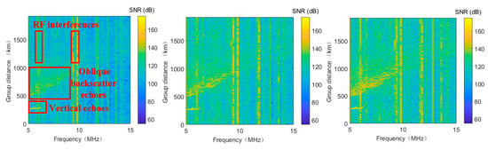 Moreover, in addition to the desired signal, for the system operating in the HF band, there are also many strong radio-frequency (RF) interferences entering the receiver simultaneously. Sometimes the intensity of these interference signals can be quite large. At 6 MHz, 9.4 and 9.8 MHz, as examples, the SNR of the interference signals even exceed 205 dB, completely submerging the useful signals, which will also cause great difficulties in the extraction of oblique backscatter leading trace.