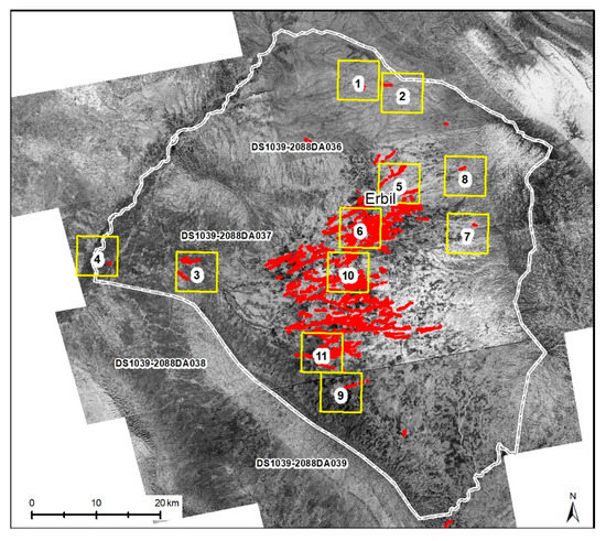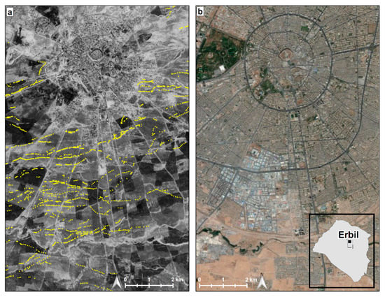The case study is the area covered by the Erbil Plain Archaeological Survey (EPAS) [63]. EPAS encompasses 3200 km2 in the center of the Erbil Governorate of the Kurdistan Region of Iraq (Figure 5). Qanat technology is used in the Kurdistan Region of Iraq, known locally as karez. Karez of Northern Iraq are one of the least-studied qanat systems of the Middle East. The only systematic study of the qanat of Northern Iraq was conducted by Dale Lightfoot under the auspices of UNESCO [64]. He recorded 683 qanat systems, using historic cadastral maps and field observation. One of the largest concentrations of qanat systems is in the EPAS area. Fifty-one qanat systems in the Lightfoot database are within EPAS area. Although the Lightfoot study used cadastral maps, these maps only document the qanat that were functional or recently abandoned in the mid-20th century.