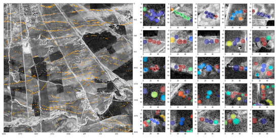 The following are available online at https://www.mdpi.com/2072-4292/12/3/500/s1, Figures S1–S22, location of training patches on the CORONA image sections. Figures S23–S33, Training results on individual patches: (a) original patch, (b) annotated shafts (green), (c) predicted shafts (yellow), (d) evaluation: TP (green), FP (orange), FN (red).