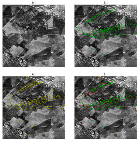 The lowest model performance was on patch 4 (a) with 23 labeled features, most with low annotation certainty resulting in the lowest precision score (0.107) and very low recall score (0.478). (b) Annotated shafts (green), (c) predicted shafts (yellow), (d) evaluation: TP (green), FP (orange), FN (red). Annotated shafts are only in the center-right part of the image (b), while FP are spread across the lower half of the patch (c). Each patch is 2000 × 2000 pixels (approximately 5.5 × 5.5 km).