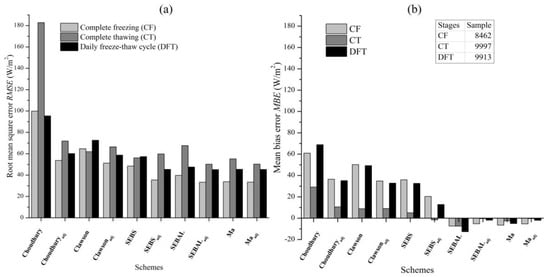 - The RMSE of each scheme was significantly different during the freeze-thaw cycle on the TP; meanwhile, the RMSE values of the three stages can be roughly presented as a whole: CF < DFT < CT. The MBE of the CT stage, whether overestimated or underestimated, was less than that of the other two stages, while the MBE values of the other two stages were close. Overall, RMSE values of the second group of schemes (SEBAL, Ma, SEBALadj, and Maadj) were smaller than that of the first group of schemes (Choudhury, Clawson, SEBS, Choudhuryadj, Clawsonadj, and SEBSadj). The MBE values tell us the G0 values simulated by the first group of schemes were obviously overestimated, and those of the second group of schemes are weakly underestimated.