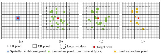 where yijk,b,t0 and ym,b,t0 are the spectral values of FR pixels aijk and am in the FR image , and yijk,b,tn and ym,b,tn are the spectral values of FR pixels aijk and am in the FR image . A number of M FR pixels with the smallest spectral difference at time t0 and tn are selected as same-class FR neighboring pixels for the target FR pixel aijk at time t0 and tn, respectively, excluding the central pixel (Figure 2b,c) [26,27]. Finally, an intersection operation is applied to the selected same-class FR neighboring pixels at time t0 and tn to produce the final same-class FR neighboring pixels (Figure 2d) [27]. If no same-class FR neighboring pixel is selected, then no same-class FR neighboring pixel information is used in the spatial term for the FR pixel under consideration.