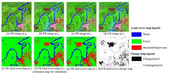 The Landsat images were classified into three land cover classes: Water, Forest, and Bareland/Impervious, using a support vector machine classifier (Figure 4e–g). The radial basis function was selected as the kernel function in support vector machine for its ability to classify remote sensing image with high accuracy [31]. The training samples of each class were selected according to Google Earth, and the endmembers were selected directly from the Landsat images. The percentage cover of the classes in the reference map was 9.38% for Water, 76.57% for Forest, and 14.05% for Bareland/Impervious. An FR land cover change map was produced by comparing the three land cover maps, and an FR pixel was labelled as unchanged in the FR change map only when its class was the same in the three land cover maps (Figure 4h). The land cover maps on 7 June 2010 and 27 September 2010 (Figure 4e,g) were used as the FR maps at t0 and tn, and the land cover map on 11 September 2010 was used as the FR map at tp (Figure 4f), which was the reference map used for validation.