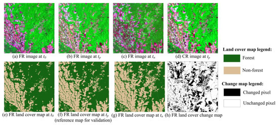 The 30 m NLCD land cover maps for the years 2011, 2013, and 2016 were used (Figure 3e–g). The original NLCD maps with 16 classes according to the NLCD classification system were reclassified into 6 classes: Water, Developed, Barren, Forest & Shrubland, Herbaceous & Planted/Cultivated, and Wetlands. The percentage cover of these classes in the reference map was 1.20% for Water, 6.92% for Developed, 0.23% for Barren, 63.99% for Forest & Shrubland, 14.62% for Herbaceous & Planted/Cultivated, and 13.05% for Wetlands. The FR land cover change map was produced by comparing the NLCD 2011, 2013, and 2016 maps (Figure 3h). An FR pixel was labelled as unchanged in the change map if it had the same class label in each of the 3 maps. Otherwise, this FR pixel was labelled as changed in the FR change map. The NLCD 2011 and 2016 maps (Figure 3e,g) were used as the FR maps at t0 and tn, and NLCD 2013 was used as the FR map at tp (Figure 3f) which was the reference map for validation.