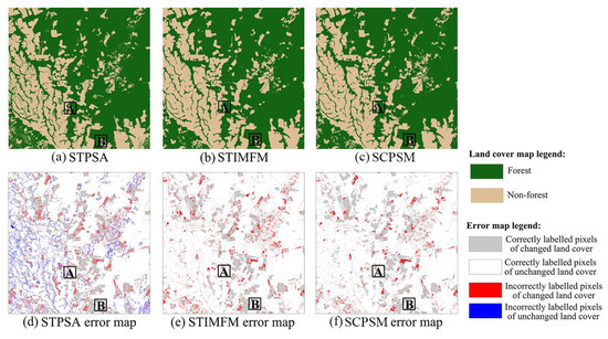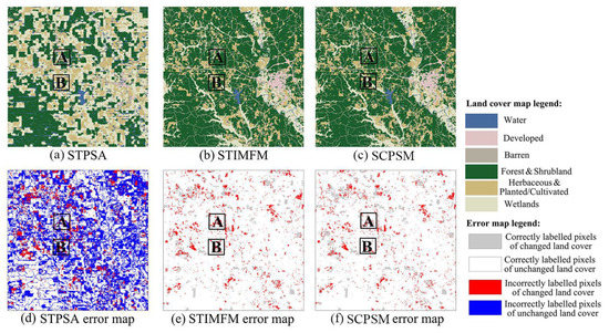 The predicted land cover maps from different methods are shown in Figure 6. The maps generated from STIMFM and SCPSM in Figure 6b,c were visually more similar to the reference map in Figure 3f than that generated from STPSA in Figure 6a. Many Forest & Shrubland pixels in green color in Figure 6a were incorrectly labeled as Wetlands pixels in the STPSA map. Many pixels incorrectly predicted as being of the unchanged class were found in the error map from STPSA, and were mostly eliminated in the error maps from STIMFM and SCPSM, showing that both STIMFM and SCPSM can predict unchanged pixels with better accuracy.