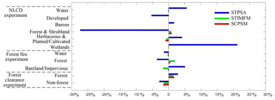 The percentage of each class in the predicted maps was compared with that in the reference map in each experiment, and the corresponding differences are shown in Figure 12. First, among different methods and in all experiments, STPSA generated the largest absolute difference in the percentage of FR pixels for all classes and in all experiments. In particular, STPSA underestimated about FR pixels of Forest & Shrubland class, and overestimated about FR pixels of Wetlands class in the NLCD experiment. This was clear by comparing the STPSA map in Figure 6a with the reference map in Figure 3f, in which many Forest & Shrubland pixels were incorrectly labeled as Wetlands pixels from STPSA. Second, STIMFM and SCPSM over- or underestimated the FR pixel of each class simultaneously. For instance, in the forest fire experiment, both STIMFM and SCPSM overestimated the FR pixel number of Forest class, and they underestimated the FR pixel number of Water and Bareland/Impervious classes. The main reason was that STIMFM and SCPSM had the same spatial, temporal, and spectral terms in their objective functions. Third, STIMFM generated relatively smaller absolute differences than SCPSM for Forest & Shrubland and Herbaceous & Planted/Cultivated classes in the NLCD experiment, as well as Forest and Non-forest classes in the forest clearance experiment. However, STIMFM only decreased the absolute difference by less than 0.3%, compared with SCPSM for these classes. By contrast, SCPSM decreased the absolute difference by about 1.5% compared with STIMFM for Water and Forest classes in the forest fire experiment.