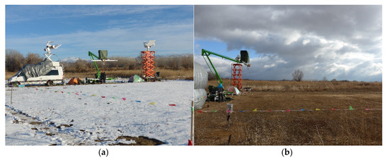 The Altay experiment: (a) the snow covered field observed by the instruments on the north edge, from left to right are: the Remote Sensing and Digital Earth (RADI) radiometer, a ground-based synthetic aperture radar system (SAR), and the Northwest Institute of Eco-Environment and Resources (NIEER) radiometer; (b) the grass mowed field before the first snowfall.