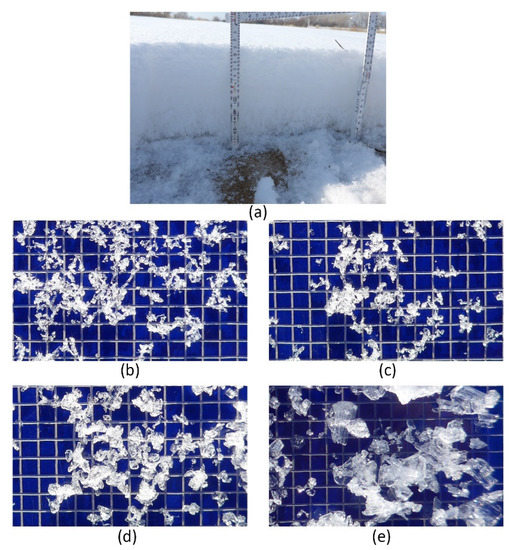 Figure 2 shows an example of the snowpit observed on 15:34 January 24th, 2018. The snow had 4 layers with a thickness of 4.5 cm, 2 cm, 2.5 cm, and 7.5 cm from top to bottom. Figure 2b–e shows the corresponding snow particle photos for each layer. The geometric snow grain size was post-processed using the method as follows. First, a human-computer interactive program was coded to georegistrate the photo using the 2-mm grid intersections. Then, an interactive dialog box was called to save the two ends of the maximum dimension (diameter) of one particle visually recognized and clicked by the observer. Only two observers were involved in the snow particle digitization, and the final result was checked and corrected by a single one. The X, Y coordinates of the paired points were converted to the lengths by the computer. Each photo was separated into 16 subphotos, and in each subphoto at least 10 particles were digitalized. Using the over 160 particles, the geometric grain size (Dmax) was calculated using the mean of the maximum dimensions, according to the definition in Mätzler (2002) [38].