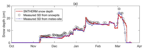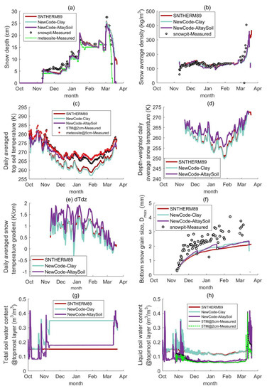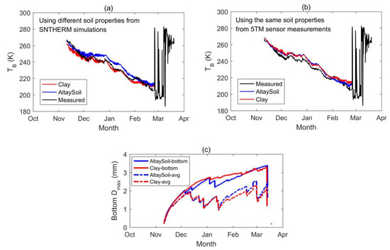 Figure 16 shows the comparison of TB using two different SNTHERM simulated soil properties (a) and the same property from 5TM soil sensor measurements (b). In Figure 16a, it shows surprisingly, the simulated TB is better using the original clay soil setting. The error is most likely from the soil dielectric constant modelling. By comparing with Figure 16b, it shows the reason is from the difference in the simulated soil properties caused by different soil parameter settings, not from the simulated Dmax difference in Figure 16c. In Figure 16c, it showed the average Dmax using Altay soil is still larger than the clay soil, which agrees with Figure 4f and the modeling theory; however, in the mid snow season, the bottom layer Dmax using clay soil can be reversely larger, due to the randomness in layer combination.