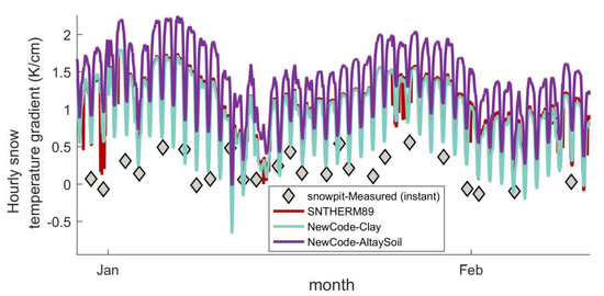 Figure 4f shows all three scenarios underestimated the observed Dmax from the snowpits. In order to support the update of grain growth coefficient (g1), an accurate estimation of the snow temperature and snow temperature gradient is the prerequisite condition. In Figure 5, the calculated and the observed temperature gradient from snowpits are compared. The later was calculated by the difference of snow temperature divided by the difference of the measured heights (). It shows the simulated temperature gradient has a strong diurnal variation—low in the daytime and high in the night time. The highest temperature gradient can reach 2 K/cm, whereas that at noon it is in general around 0.5 K/cm or can even be negative. Two reasons resulted in a measured smaller temperature gradient compared to the simulations. First, most measurements of snow temperature were at the daytime, and reasonably it reaches the low limit of the simulations. Second, the measured temperature of the bottommost snow layer can be biased low. The insertion of the temperature sensor easily broke the sugary depth hoar at the bottom and can mix cold air into the snow around the sensor. We think the temperature of the topmost soil layer is a more reliable validation reference than the bottom snow temperature measurements. Figure 6 compares the instant snow layer temperature and the SNTHERM snow temperature. It showed the temperature using the clay soil (scenarios 1 and 2) biased low for 2 to 3 K. The prediction using the Altay site-specific soil (scenario 3) is better. As a conclusion, the temperature simulation using scenario 3 improves over scenarios 1 and 2, and can be used for the grain growth coefficient adjustment.