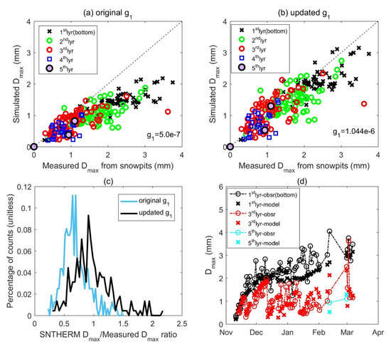 After the snow temperature and the temperature gradient were accurately provided using the Altay site-specific soil parameters, the next step is to improve the grain growth coefficient (g1). In Figure 7a, the simulated Dmax from scenario 3 is plotted against the measured Dmax from the snowpits. The SNTHERM simulated much more snow layers (1–34 layers) compared to the in-situ measurements (1–5 layers). Here we extracted the SNTHERM snow layers within the height range of the snowpit layer and took the average. Currently, using the default g1, the simulated Dmax biased low, for about −0.55 mm in average (RMSE = 0.74 mm). The ratio of the simulated to the measured Dmax is 0.69 ± 0.22.
