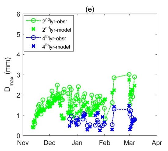 Figure 7b showed the Dmax comparison using the updated g1. After revision, the mean bias is reduced to −0.15 mm (RMSE = 0.47 mm). The ratio of the simulated to the measured Dmax is changed to 0.97 ± 0.33. By changing g1 to match the observed geometric grain size, a well-defined physical meaning is introduced to the SNTHERM snow grain size, which was previously considered as a model-specific, effective grain size. Figure 7c presented a comparison of the histogram of the simulated to measured Dmax ratio. Figure 7d,e showed more details of the time-series varied Dmax trend at different layers in the bottom-first order.