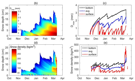 Figure 8b,e show the snow grain size and the snow density profiles. In Figure 8c,e, depth-weighted average values and the values at the surface and the bottom of the snow are presented. The fluctuation of the surface layer geometric grain size and density is due to new snowfalls. After a snow layer is initialized from a new snowfall, in theory, the snow grain size monotonically increases. However, the combination of snow layers can reset the simulated values. For the bottom snow layer, two reasons from the model numerical implementation can result in a decreased snow grain size and density. Firstly, when the bottom layer is compressed to a thickness smaller than the limit, the bottom-most layer will be combined with the 2nd bottom layer and the snow parameters are averaged. Such fluctuations can also be found using the SNTHERM89 code. Secondly, the bottom snow mass can be reduced in SNTHERM via the water vapor movement, and this can result in a ‘disappearance’ of the bottom layer.