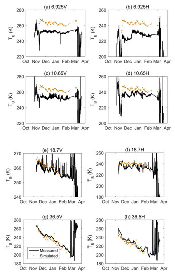 Figure 15 shows the comparison of measured and simulated daily TB at all stations. The agreement is higher for frequencies larger than 10.65 GHz. The RMSE is 6.91 K, 8.2 K, 13.34 K at 18.7, 23.8 and 36.5 GHz, vertical polarization, respectively. At 10.65 GHz, the correlation between the measured and the simulated TB is smaller, whereas the RMSE is 6.46 K and 12.93 K at vertical and horizontal polarization, respectively. The simulation at this frequency is influenced strongly by the soil modeling beneath the snow. We utilized the same soil parameters as in the Altay experiment, so the accuracy will be reduced. More important, usually the underlying background beneath the snow cover in the pixel scale is different with the bare soil assumption. For Figure 15a,b, we did not correct the time independent offset sometimes found between the simulated and the observed TB time series caused by the soil modeling and the complex land surface conditions, which may be considered as a systematical bias like in Figure 9 and Figure 10. The largest RMSE (of 24.95 K) is found at 89 GHz because this frequency is very sensitive to the grain size of the topmost snow layers. A good point is the simulated TB is unbiased in 160–200 K range. The TB above 200 K is biased higher, which indicates a possible underestimation of new snow grain size using the SNTHERM inner computation module instead of a user-defined value. The small 89 GHz TB measurements occurred when the snow crystals at the snow surface has grown large, before the next new snowfall.