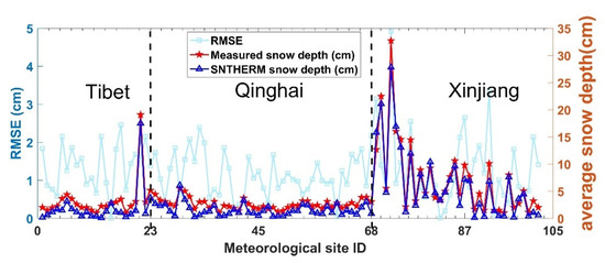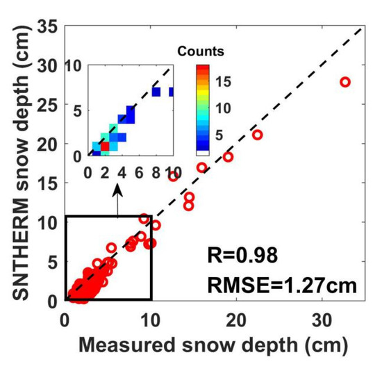 Figure 11 shows the comparison of daily measured snow depth from the 102 meteorological stations in the 2008–2009 winter with the SNTHERM simulations. The result is presented into 4 subplots, for 4 different regions. The points for northern Xinjiang and southern Xinjiang are separated due to strong snow depth difference. The snow depth RMSE is 4.03 cm in northern Xinjiang, 2.57 cm in southern Xinjiang, 2 cm in Qinghai, and 3.07 cm in Tibet, respectively.