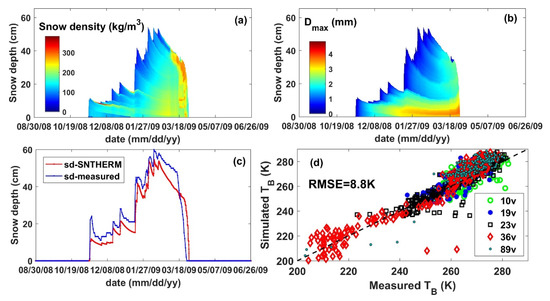 - Kang, D.H.; Tan, S.; Kim, E.J. Evaluation of Brightness Temperature Sensitivity to Snowpack Physical Properties Using Coupled Snow Physics and Microwave Radiative Transfer Models. IEEE Trans. Geosci. Remote Sens. 2019, 57, 10241–10251. [Google Scholar] [CrossRef]