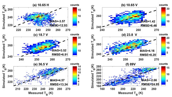 Comparison of the measured and the simulated brightness temperature at all 102 sites at different frequencies and polarizations (pol.): (a) 10.65 GHz H-pol., (b) 10.65 GHz V-pol., (c) 18.7 GHz V-pol., (d) 23.8 GHz V-pol., (e) 36.5 GHz V-pol., (f) 89 GHz V-pol. The color bar represents the number of points at each 1 K measured and simulated TB interval. The unit of the labeled root-mean-squared error (RMSE) and mean bias (MB) statistics is K.