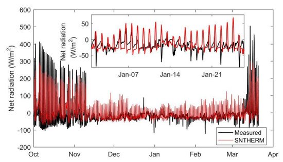 In Section 2.1, we mentioned the downwelling longwave radiation inputted to the SNTHERM model is from the GLDAS dataset. The station does not have the downwelling longwave radiation measurement. We didn’t force the simulated net radiation to match the observed net radiation, because we considered the difference between the SNTHERM model pure snow assumption and the in-situ condition influenced by the dry high grass. A natural condition is required by the meteorological station observation; however, as seen from Figure 17, the measured net radiation has a smaller peak at noon, influenced by the low albedo and the shade from the dry high grass.