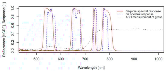 Relative spectral responses of the four Parrot Sequoia cameras as well as the most closely corresponding Sentinel 2A bands (bands 3, 4, 6 and 7), overlaid on a measured grass reflectance spectrum.