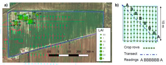 Position and values of LAI measurements available for the analysis (a), acquired along a transect on 10 × 10 m plots (b).