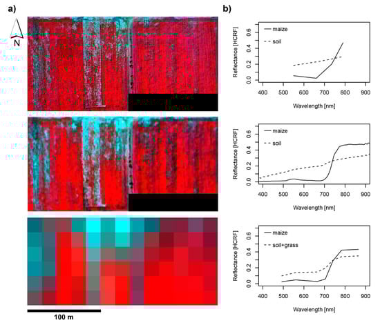 The HCRF products were derived from the Sequoia, HyPlant and S2 image data and georeferenced and clipped to the extent of the drone dataset. The georeferencing root mean squared error for the Sequoia A2 orthomosaic was 0.007 m. A visual comparison of false-colour infrared composites (Figure 5a), as well as representative spectra, are presented (Figure 5b). It is evident that the drone data can resolve the row structure of the crop and small patches of bare ground. The detailed information on the spatial heterogeneity of the field is partially lost at the comparatively coarse resolution of S2. At this resolution, it was furthermore impossible to extract pure spectral information on soil due to mixed pixels. The HyPlant dataset was able to well-represent the variability of vegetation cover while the reflectance spectra provide an additional wealth of information, particularly by finely resolving the green-peak (550 nm), the chlorophyll absorption in the red wavelength regions (600–700 nm), as well as the sharp red-edge increase in reflectance of healthy vegetation (730 nm). These wavelength regions were all covered by the Sequoia and S2 sensors resolving the same features but at a much coarser spectral resolution.