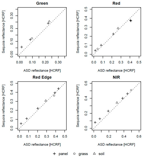 The Sequoia derived HCRF values extracted from the mean of the central pixels of the reference panels imaged in-flight, as well as for a grass and soil target, were compared against in situ ASD-measured HCRF using MAD (Figure 6, Table 2). For the green band, the two brightest panels (>39% reflectance) were saturated and therefore excluded from the analysis. This sensor-inherent issue for the visible bands has been verified by previous studies [35,38] and limits its applicability to surfaces of intermediate brightness.