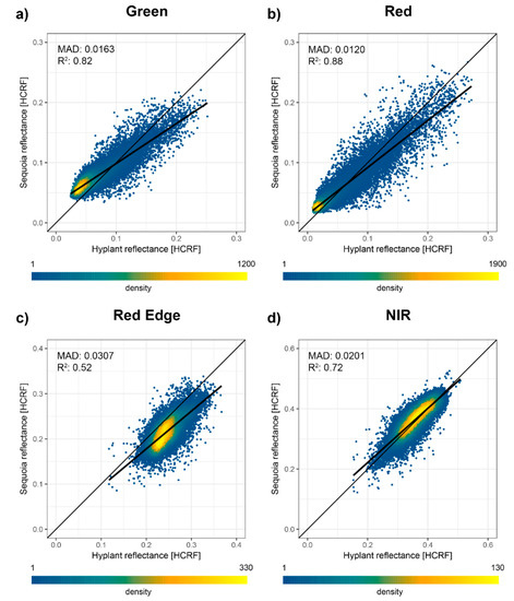 For an intercomparison of Sequoia derived HCRF values with HyPlant HCRF, the drone derived HCRF orthomosaic was spatially resampled to 1 m spatial resolution. The hyperspectral reflectance values were convolved with the Sequoia SRF, following the basic procedure described by [37] to yield HCRF comparable with the Sequoia bands.