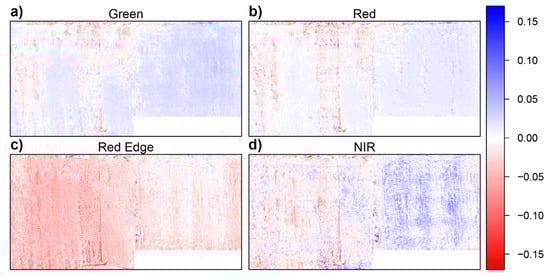 Possible view-angle related effects are visible in the difference image of the NIR band (Figure 8) as faint horizontal striping parallel to the drone flight path and perpendicular to the vertical striping from variable vegetation cover.