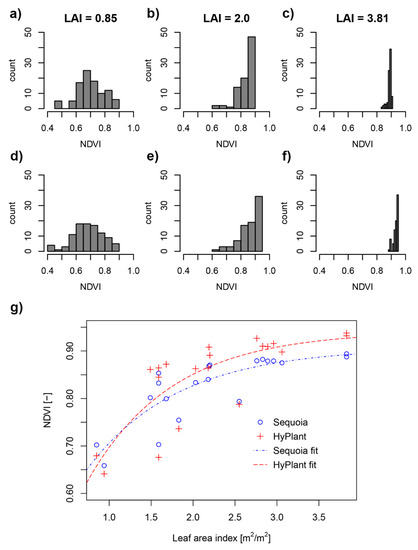 Histograms of Sequoia (a–c) and HyPlant (d–f) NDVI values for three 10 × 10 m ESUs of varying LAI. (g) NDVI values averaged over ESU extents and the corresponding LAI value measured in the field. Non-linear model fits are provided for illustrative purposes.