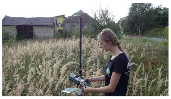 The field studies were conducted in the summer of 2017. Compact polygons (in the shape of circles with a radius of 3 meters) of Rubus spp., Solidago spp., Calamagrostis epigejos, and other background plants were located within the research area with the help of the Leica CS20 GNSS device (Figure 2). The number of polygons was proportional to the prevalence of species in the research area and amounted to 50 polygons for blackberry and wood small-reed, 60 polygons for goldenrod, and 100 polygons for background plants.