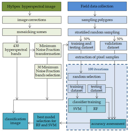 The aerial hyperspectral images were prepared for further processing in accordance with the diagram presented in the schema (Figure 3). The data obtained by hyperspectral sensors were converted to radiance units with HySpex RAD software. Then, the hyperspectral image was subjected to geometric correction, which employed the digital surface model in PARGE (PARametric GEocoding) software (ReSe Applications LLC, Wil, Switzerland), and atmospheric correction was performed with the MODTRAN5 model in ATCOR4 (ATmospheric CORrection) software (ReSe Applications LLC, Wil, Switzerland). Nine flight lines were mosaicked and re-sampled to achieve a uniform spatial resolution of 1 m. Next, the last 21 bands in the SWIR range were removed because of the high level of noise caused by the sensor’s lower SNR (Signal to Noise Ratio) at the extreme ranges of the imaged spectrum, which ultimately resulted in a 430-band image in the spectral range of 416.18–2396.44 nm.