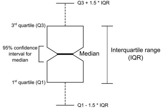Afterwards, the best models for each classifier and data set were selected on the basis of the mean F1 scores for all classes (based on the validation data), and the images were classified. The significance of statistical differences between the accuracy of the models was checked using the Mann–Whitney–Wilcoxon test [49] (significance level = 0.05). The Mann–Whitney–Wilcoxon test is well suited for testing differences between non-normally distributed populations [26,50]. Distributions of achieved accuracy measures for all classification scenarios were visualized using box plots. A detailed explanation of boxes used in box plots is shown in Figure 4.