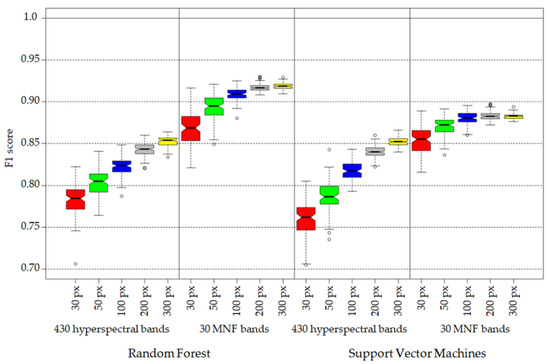 - Three hundred pixels per class is the preferred number of samples in the training set for classification of the analyzed plant species with the help of the SVM and RF methods. Fewer pixels result in a significant decrease in classification accuracy and less stable results. In our case, we managed to find the optimal number of pixels in training data sets per class only in the case of the SVM classifier applied to MNF data. Figure 6 shows that there was no significant statistical difference between tests performed on MNF bands with 200 and 300 pixel samples per class. Hence, 200 pixels per class in the training data set for 30 MNF bands and the SVM classifier is optimal.