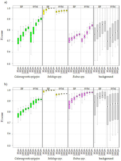 The increase in the number of pixels used to train the F1 score classification for the three species analyzed in this article resulted in an increase of these values, but also a simultaneous decrease in their distribution width, which indicates stabilization of the results. Our observations indicate that the preferred number of training patterns is at least 300 pixels per class, regardless of the classifier used. In the case of 30 MNF and the SVM algorithm, 300 was the optimal value because there were no statistically significant differences between training data sets containing 200 and 300 pixels per class (Figure 6). Due to the unavailability of the larger continuous areas of invasive plants on our research area, we have limited the analysis to 300 pixels, and therefore we were unable to assess impact of larger number of pixels per class in training data set on achieved classification results. A similar trend was noticed by testing different sets of training pixels (from 10 to 30 pixels) and raster data for the classification of 20 herbaceous species in Eastern Hungary by means of the SVM and RF algorithms [27]. Moreover, the highest overall accuracy (SVM: 82.06%; RF: 79.14%) was obtained using the largest of the tested sets of patterns (30 training pixels). The overall classification accuracy decreased with a decreasing number of training pixels (lower by about 2 percentage points for the set of 10 training pixels).