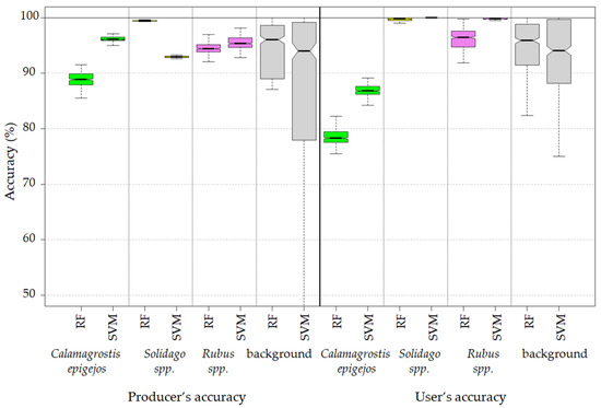 For the Rubus spp. class, the RF classifier yielded a lower median user’s accuracy than that of SVM by three percentage points, while the differences in the producer’s accuracy levels between the classifiers were small. Both the producer’s and user’s accuracies for Solidago spp. were very high (close to 100%), a slight underestimation was detected only in the case of the SVM classification (producer’s accuracy about 93%). In contrast, the Calamagrostis epigejos class achieved the lowest median producer and user accuracies of all classes. The SVM classifier achieved higher producer and user accuracy levels for C. epigejos (PA = 96%, UA = 87%) than the RF classifier (PA = 88%, UA = 78%).