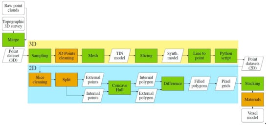 The CLOUD2FEM procedure is presented and validated to transform 3D point clouds of complex and irregular objects to 3D FEA models [47,48]. The flowchart of this method is shown in Figure 1. The procedure includes the point cloud as a stacking of point sections from TLS. Voxel elements are constructed by transforming the points into the eight-node hexahedral finite elements required. In this way, a discretized geometry is constructed with voxel elements and ready to be used in numerical computation. If both inner and outer surfaces of the object are detected by TLS, the whole 3D numerical structure can be obtained efficiently. Detailed parts with greater curvature in the model are processed with smaller discretization to obtain smoother features. This procedure helps to improve the final accuracy of the FE computation.