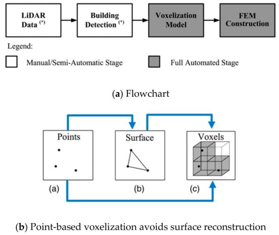 A pixelated fusion method regarding solid model generation via actual points-based voxelization to carry out FEA is proposed by [49]. The flowchart can be found in Figure 2a. The input of this research is the point cloud which is segmented from light detection and ranging (LiDAR) data. The asterisk in Figure 2a means the preparation of LiDAR and detection of the building object involve multiple steps outside the scope of this reference’s scientific contribution. Most previous voxelization methods focus on the surface representations of structures. Hence, the key step of these methods must identify through which voxels the surfaces pass [49]. By contrast, as it is shown in Figure 2b, the innovation is in the voxel generation step. The voxelization based on point clouds in this research operates on the points data directly. Taking the measured points as internal points, the hexahedral elements are created around them. In this process, the surface derived is not required. The pixelated model is obtained. The resulting pixelated model maps directly to the FE discretization model to realize the whole FE computation process.