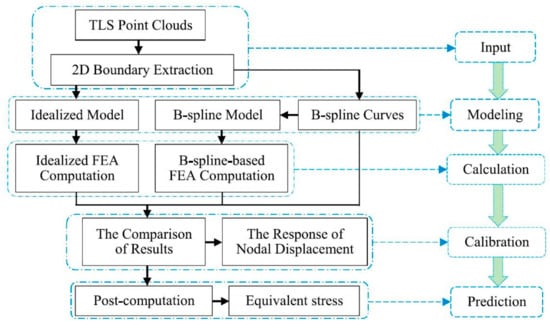 The authors of [44] point out that the structural analysis in the FE computation requires highly accurate spatial models. Traditional model acquisition methods rely on manual measurements. They are prone to obtain lots of errors in the results. Therefore, geometries with unknown accuracies and many geometric simplifications are applied into numerical computation, which results in distortions of the computation results [45]. Combining TLS and FEA was proposed previously, aiming at reducing the errors in the health monitoring of structures [46]. Complex FEA models with more detailed accuracies and less errors have become available by employing remote sensing technologies, such as TLS and photogrammetry. This is also a main trend and method to obtain more accurate FE computation results.