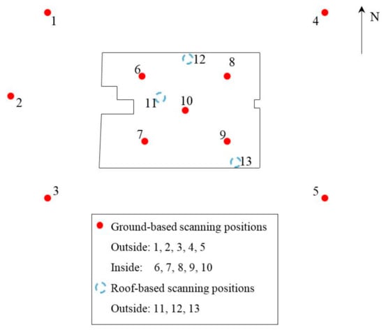 The scanning positions are separated into three parts, as it is shown in Figure 6 from the top view. The north direction is marked as N here. There is a total of 13 positions for scanning totally. From the ground-based scanning positions outside the building, there are five positions to capture the outside details: 1, 2, 3, 4, and 5. There are also five scanning positions inside the building: 6, 7, 8, 9, and 10. There are normally only one or two scanning positions inside such a building. However, there are four forced pillars inside the building. Consequently, the number of scanning positions is increased to five to capture the details of the forced pillar. The final scanning positions 11, 12, and 13 are based on the building roof.